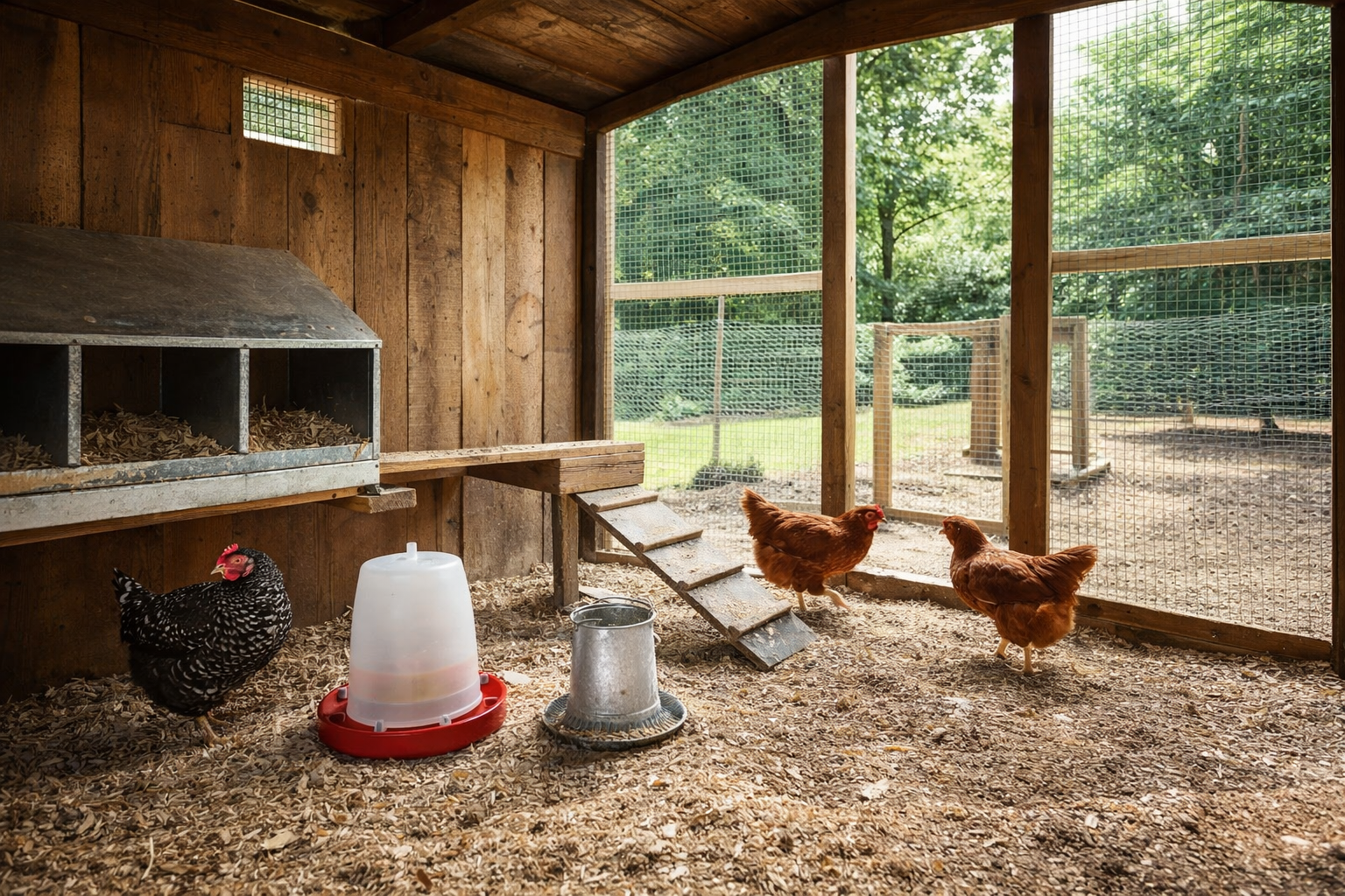 Click each bubble on the picture to learn how water, feed, ventilation, coop design, and predator safety keep your chickens healthy and protected year-round.